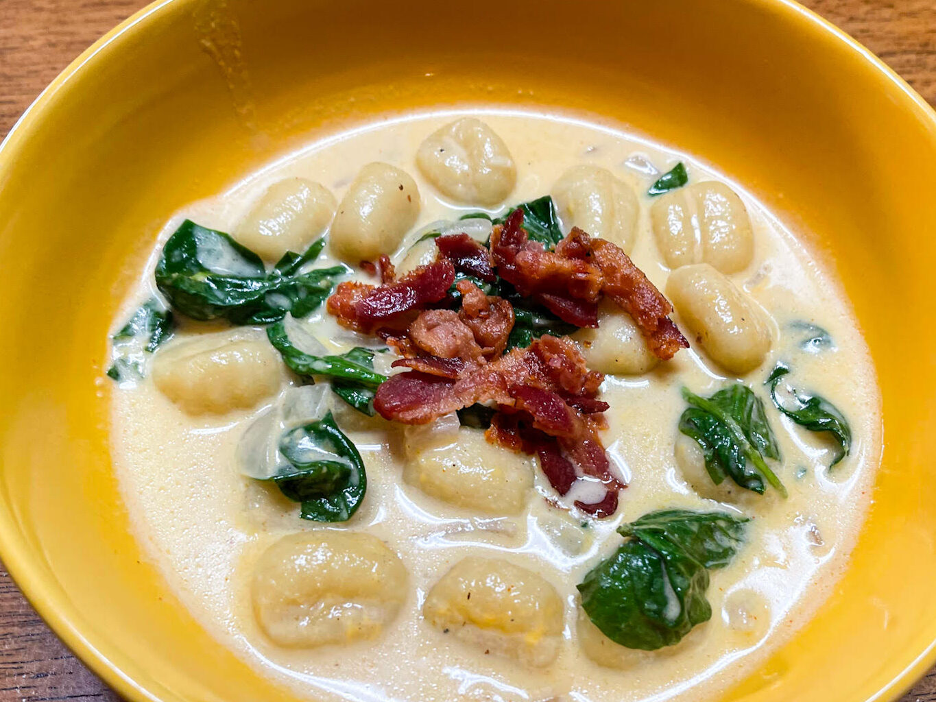 - Stir in spinach until wilted. Allow to simmer for 5 minutes. You may stir in crisp bacon pieces or just add to individual bowls of soup.
