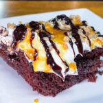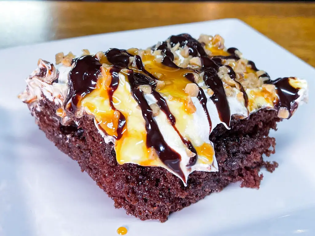 - Drizzle with more caramel sauce and chocolate sauce over the toffee bits on the cake. Enjoy.NOTE: Cake should be refrigerated due to the cool whip.