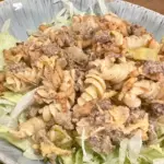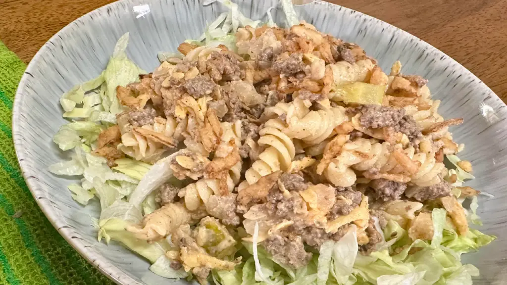 - In the large mixing bowl with the cooked ground beef add cooked, cooled pasta, shredded cheese, dressing, and french fried onions. Toss everything together to coat evenly.