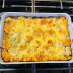 - Pour ground beef cheese mixture all over the biscuit pieces in prepared baking dish.