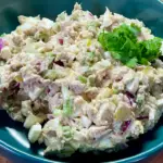 - Dice celery and red onion and add to bowl with tuna and eggs. Add in chopped pickles.NOTE: you can replace the pickles with a couple TBS of dill relish if desired.