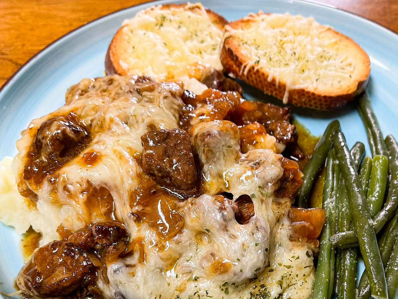 - Remove lid and top with 4 oz shredded swiss/grueyer cheese. Place lid back on to allow cheese to melt. Garnish with dry or fresh parsley.