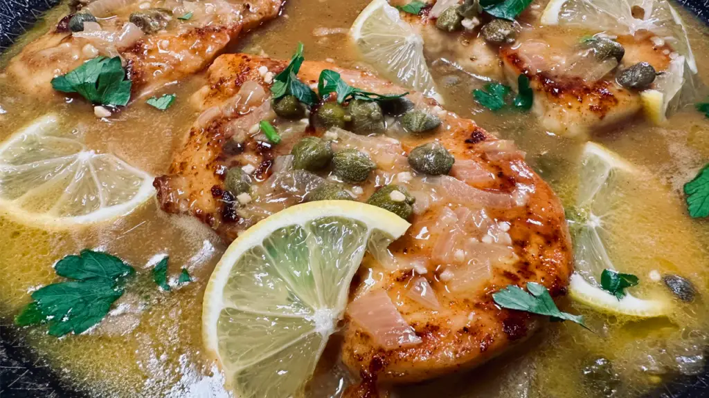 Lemony, Buttery, Caper Topped Tender Golden Chicken for a Delicious Weeknight Meal.