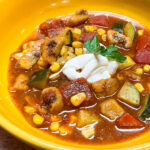 In a large Dutch oven or soup pot heat oil over medium high heat. Add in diced onions & zucchini. Season with salt & black pepper. Cook until softened.