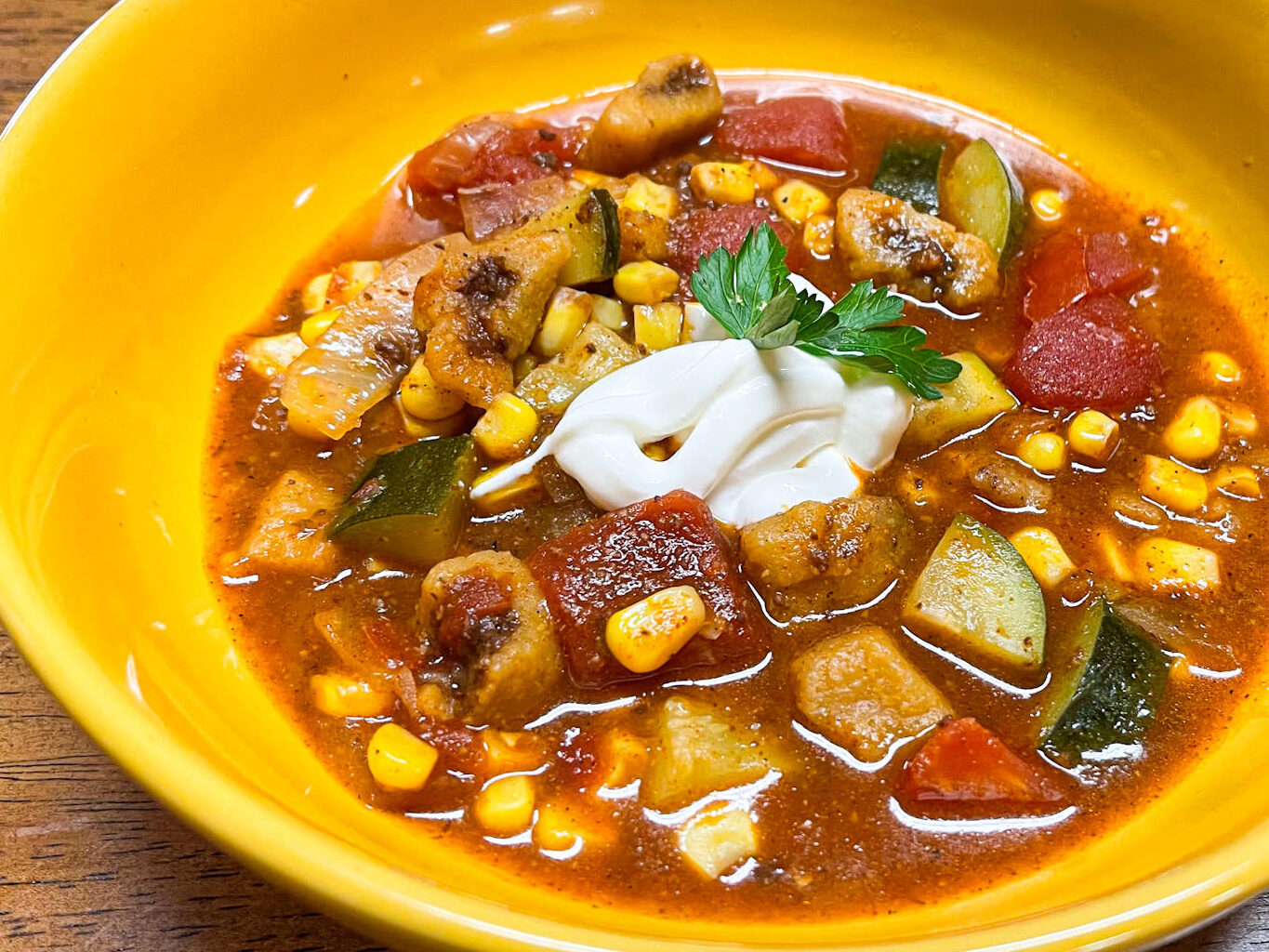 Stir in canned diced tomatoes, corn, chicken broth, and taco seasoning. Simmer for 15 minutes.