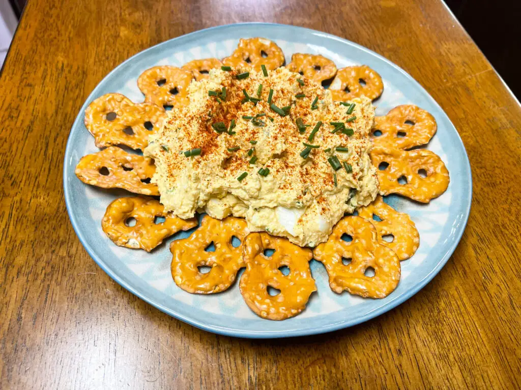 - Place mixture onto a serving plate and dust with paprika and extra snips of chives. Serve up with crackers, carrots, celery, or pretzel crisps.