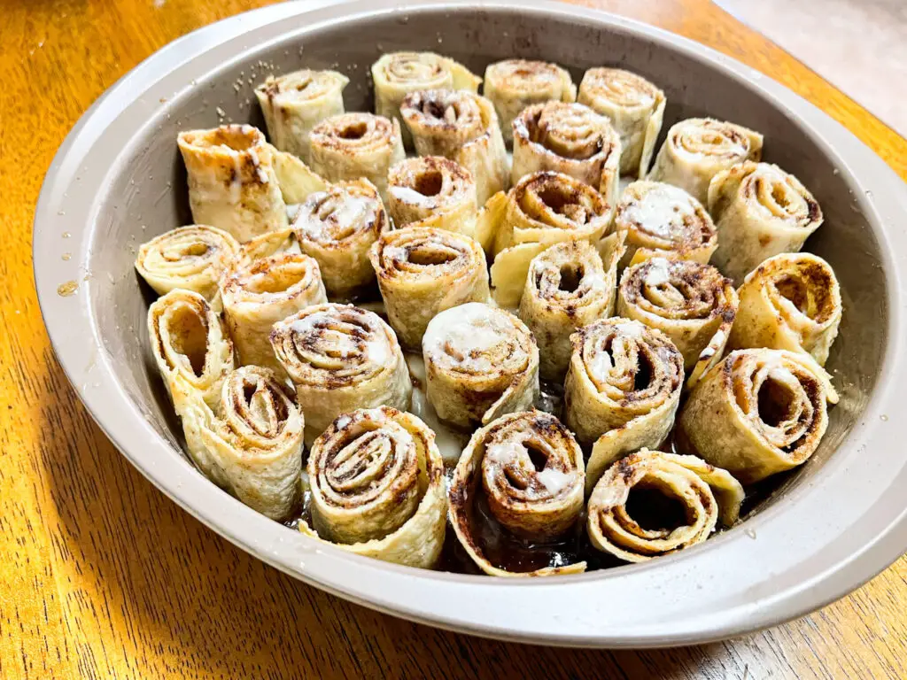 This recipe allows you to make as many tortilla cinnamon rolls as you need. This recipe makes an 8 x 8 pan of the rolls.