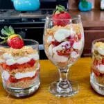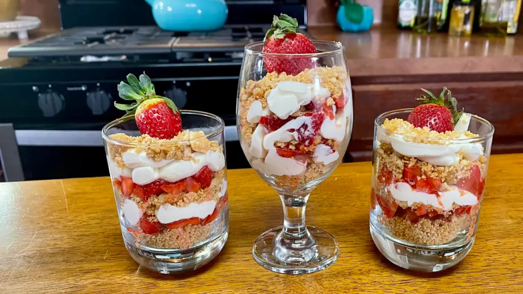- Top with cookie crumb and a whole strawberry. Complete the other 3.