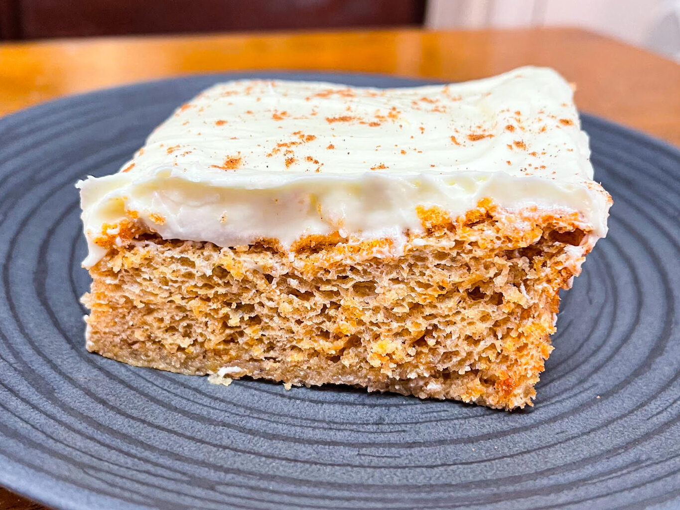 - Use all frosting to frost the cooled cake and smooth evenly. Sprinkle on extra pumpkin pie spice blend. Cut into squares for serving. Enjoy.