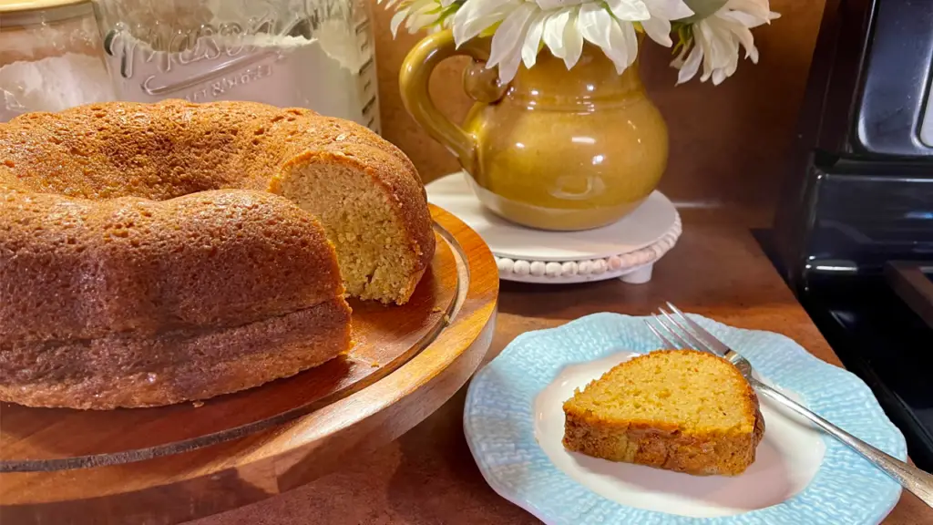 - Poke holes on top of the hot cake. Pour glaze all over the cake. Loosen up cake from pan. Place cake platter upside down on pan and flip cake onto platter.